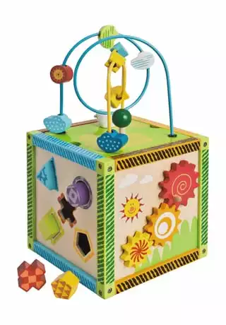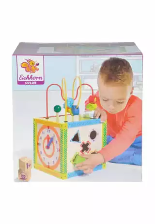 Eichhorn Color, kleines Spielcenter: Das Spielcenter von Eichhorn Color sorgt für unendlichen Spielspaß durch die vielen unterschiedlichen Aktivitäten, die dieser Würfel bietet. Diese Spielmöglichkeiten, darunter fallen die Motorikschleife, die Uhr, das Motorikspiel, das Drehspiel und die 5 Steckbausteine, fördern den Lernprozess der Kinder und unterstützen die Entwicklung des Feingefühls. Der Artikel hat eine Gesamtgröße von 20x20x37cm und ist für Kinder ab 1 Jahr geeignet.
