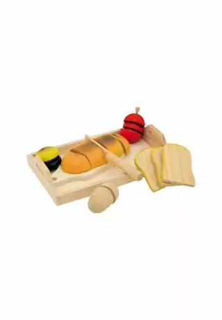 Mit diesem tollen Set können die kleinen Köche spielend leicht das Schneiden und das Zubereiten eines Frühstücks lernen. Das Holz-Set besteht aus einem Tablett, einem Schneidebrett, einem Messer, einem Laib Brot, drei Toastbrotscheiben, einem Burger, einer Tomate und einem Ei. Alle Nahrungsmittel lassen sich spielerisch leicht in Stücke schneiden und wieder zusammenstecken, da sie mit Klettverschlüssen versehen sind. Das Tablett besitzt zwei Griffe, wodurch das Set überallhin transportiert werden kann. Geeignet ist es für jede Spielküche.